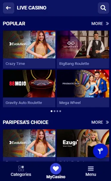 Globally, the gambling block is divided into two major sections: Casino and Live Casino. The first section of PariPesa contains games in which the result is determined by a random generator. In this area, users play independently without the participation of third parties. The largest category is Slots. They are divided by theme and design, but the principle is identical: the player needs to collect a combination of pictures, fruits, jewels and so on. The more complex and rarer the combination, the higher the winnings. Also in this section are available table games, Crash game Aviator and others.